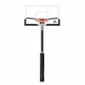 Стационарная баскетбольная стойка DFC ING72GU относится к серии антивандальных стоек. Точки крепления на этой модели находятся по краям щита, что повышает надежность конструкции. Кольцо крепится напрямую к основанию, что увеличивает максимально допустимую нагрузку на него.   Щит изготовлен из закаленного стекла толщиной 10 мм и имеет размерность 180 х 105 см (72’’). По периметру щит имеет кант из металла. В нижней части щита и на стойке установлено защитное покрытие Poly Pade. Стойка комплектуется кольцом DFC R3 с амортизацией, которое выдерживает нагрузку до 300 кг в передней части. Бесступенчатая регулировка высоты с помощью ручки в диапазоне от 245 до 305 см. Основание стойки бетонируется с помощью 4 анкеров (в комплекте), размер ямы под площадку должен составлять 50х50см. В целях безопасности и во избежание повреждения оборудования запрещается висеть на кольце и других элементах баскетбольной стойки.